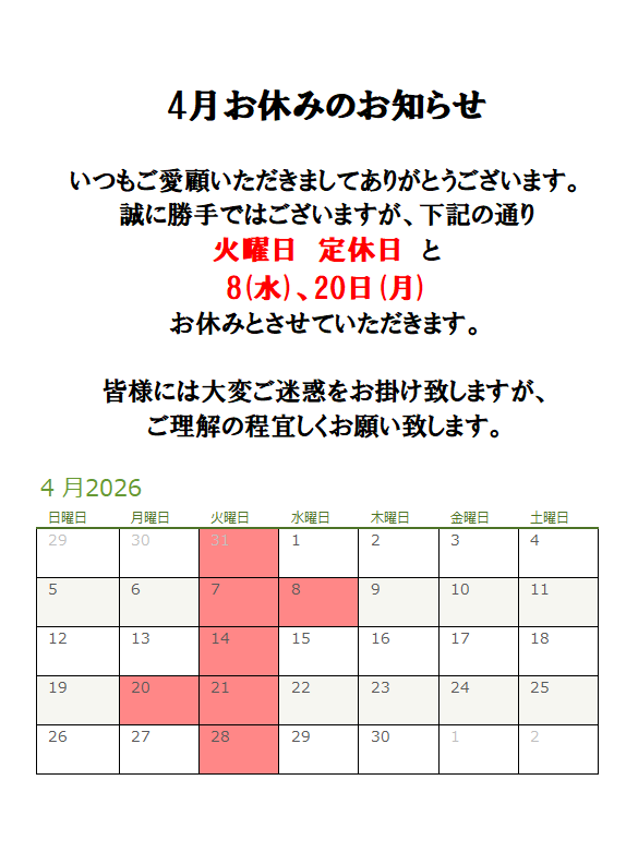 Uncategorized 令和8年4月のおやすみのお知らせ Posted 2026-03-302026-03-30 jtt いつもご愛顧いただきましてありがとうございます😊 4月のおやすみのお知らせを致します。 誠に勝手ではございますが、火曜日 定休日 と 8(水)、20日(月)お休みとさせていただきます。 皆様には大変ご迷惑をお掛け致しますが、 ご理解の程宜しくお願い致します。